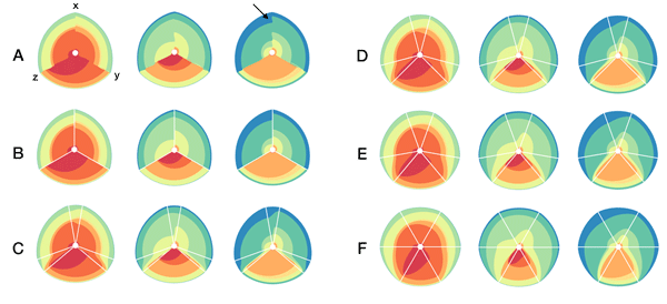 Assuming a detection event contains a mapping to an attack stage (MITRE ATT&CK is a good start), we can use the following key dimensions for the axes in the plot: Time of Detection, normalized Severity, and Attack Stage. With every complete ‘ring’ representing a single alert, and axes directed inside-out, an alert cluster can produce a unique visual shape.