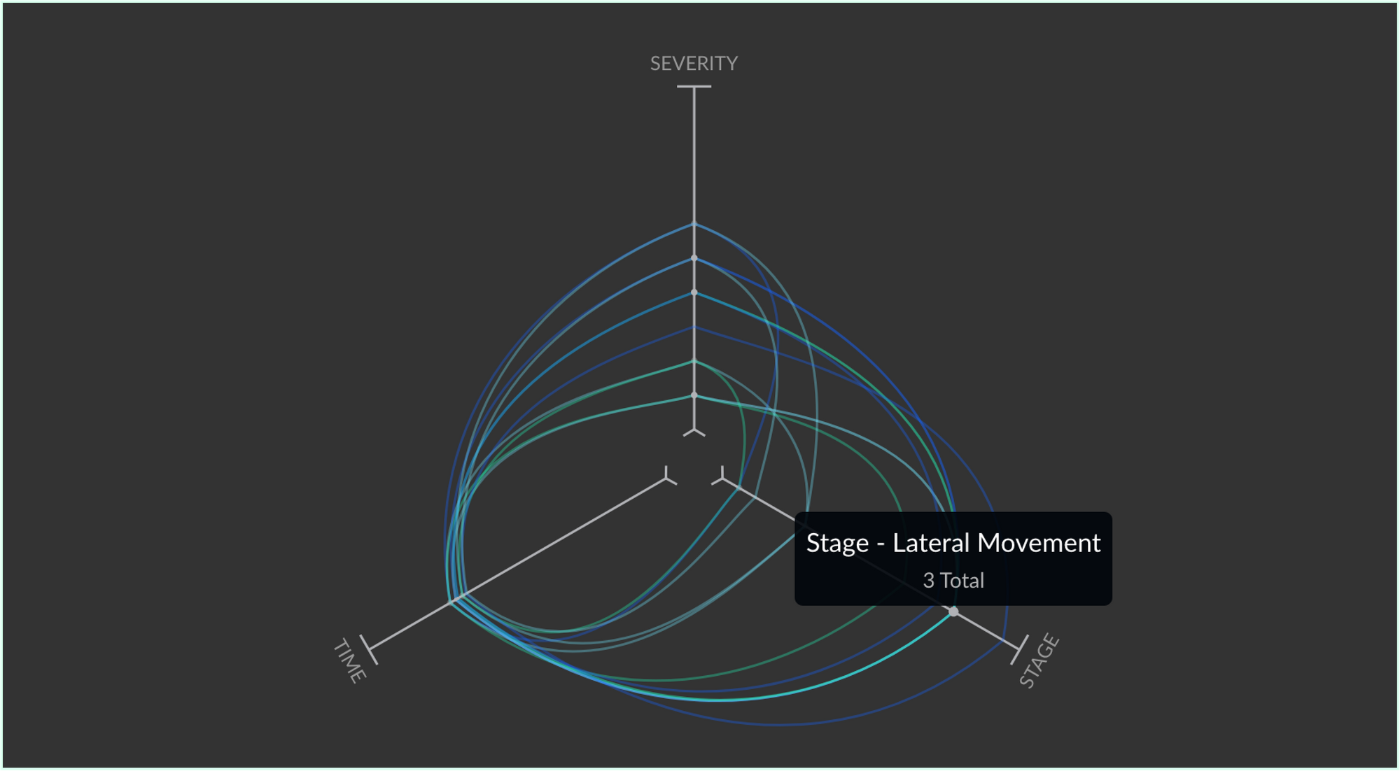 What this means is that less severe detection events which occurred earlier, mapped to early attack stages (e.g., Reconnaissance), has smaller rings than those which occurred more recently, represent later stages (e.g., Exfiltration), and tagged as higher severity.